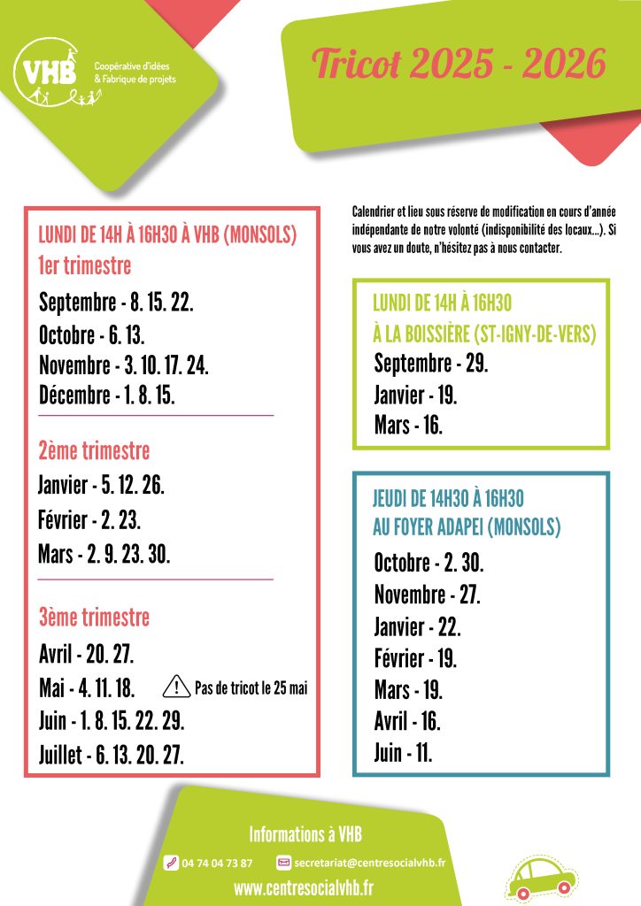 Suite à la sollicitation d’un groupe d’habitantes, l’atelier tricot est proposé depuis novembre 2011. Animé bénévolement par Marie-Annick et les participants. Ces temps d’échanges de savoir-faire sont ouverts à tous et toutes : de niveau débutant à confirmé. Les participantes s’échangent des astuces centrées essentiellement sur le tricot. Elle peuvent utiliser une machine à coudre. Chacun apporte son matériel (aiguilles, laine…) mais VHB peut également en fournir. Il s’agit généralement de confections personnelles mais il y a parfois des projets communs. En effet une très grande couverture en patchwork tricot avait été réalisée.